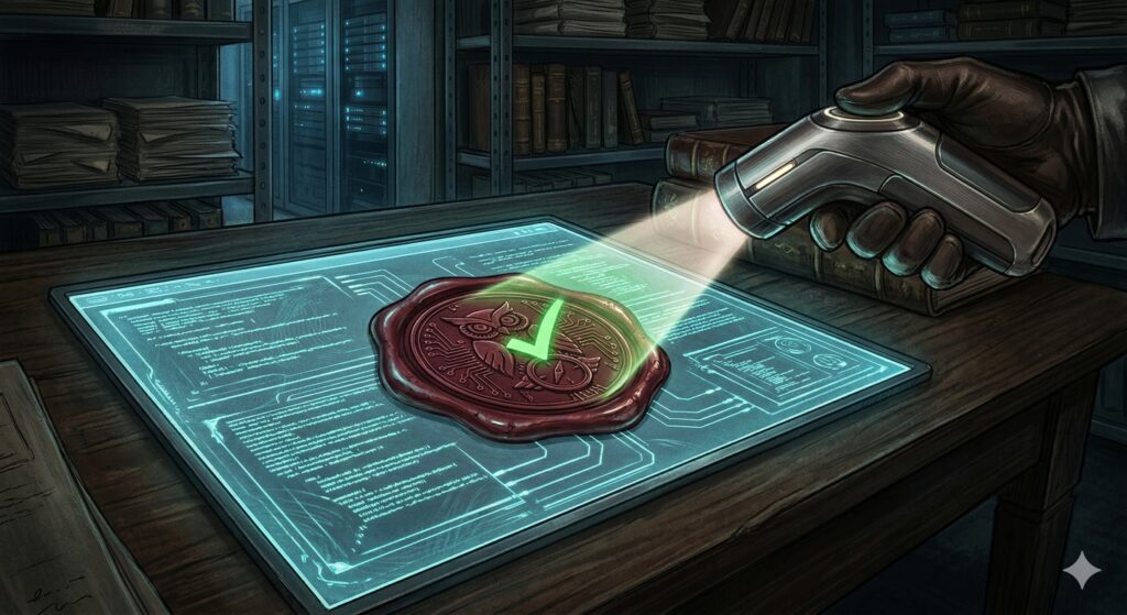 受け取る本人の秘密鍵でデータを加工すると、それは「その人しか作れないデータ」になります。誰でも持っている公開鍵(南京錠)を使えば、そのデータが本当に本人の鍵で作られたものかを確認できるのです。「中身を隠す」ことと「本人が書いたことを証明する」こと。数学の鍵はこの二つを完璧にこなします。