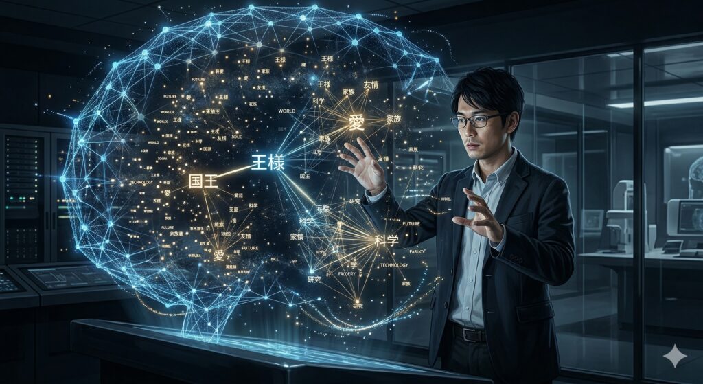 AIは単語を文字としてではなく、数千次元の空間にある「座標(ベクトル)」として捉えます。 例えば、「王様」と「女王」は近くにあり、「王様」から「男」を引いて「女」を足すと「女王」の位置にたどり着く……といった具合に、言葉の「意味」を空間上の位置関係として理解するのです。