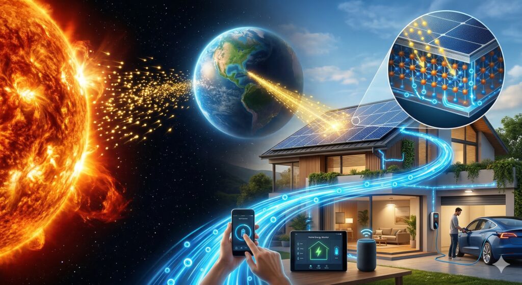 太陽光パネルは、もはや単なるエコな道具ではありません。宇宙の核融合から生まれた光のエネルギーを受け取り、原子レベルで電子を躍動させ、私たちのスマホや照明を動かす。それは、宇宙と私たちの生活を直接繋ぐ、壮大な「バトンタッチ」の現場です。