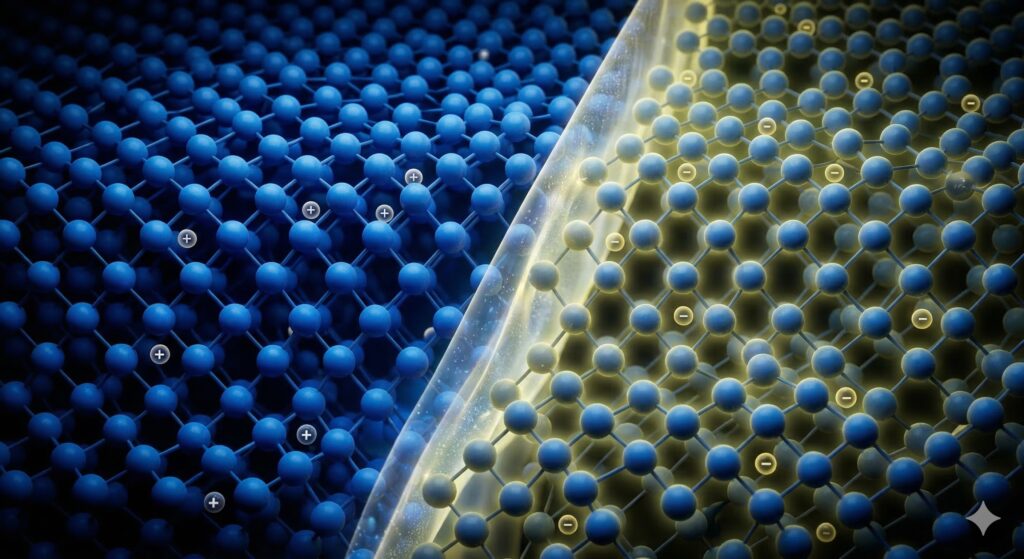 この二つをぴったりと貼り合わせた境界線(P-N接合)こそが、今回の事件が起きる「犯行現場」となります。この境界には、目に見えない「電位の坂(壁)」が出来上がっています。