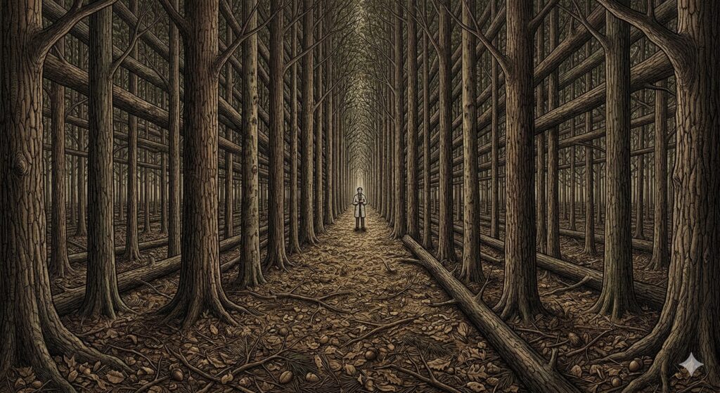 もしあなたが、地平線の先まで無限に続く広大な森の中に立っているとしたら、どの方向を見ても必ず「木の幹」が視界を遮るはずです。近くの木の間から遠くの木が見え、さらにその隙間からもっと遠くの木が見える……。結果として、あなたの視界は木の幹で埋め尽くされ、森の外を見ることはできません。