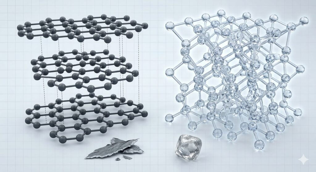ダイヤモンドの成分は「炭素」です。これは、鉛筆の芯に使われる「黒鉛(グラファイト)」と全く同じ物質です。黒鉛の状態では、炭素原子は層状に重なっているだけで、横からの力には非常に弱く、簡単に剥がれてしまいます。