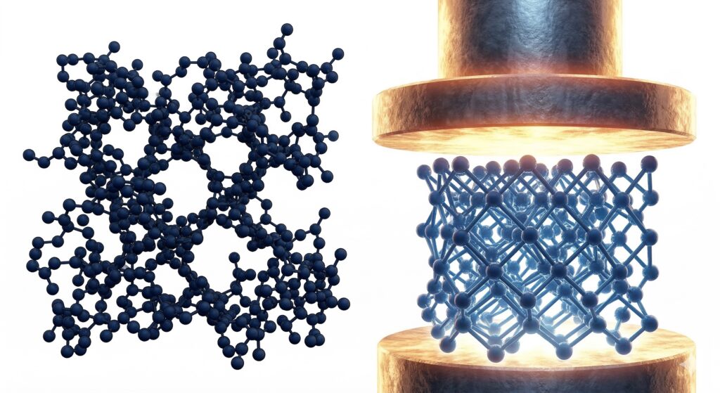 しかし、ただ圧力をかけるだけでは、原子たちは頑固でなかなか動きません。そこで「熱」の出番です。高温状態になると、原子たちは活発に振動し始め、移動しやすくなります。 この「熱による自由度」と「圧力による強制」が組み合わさった瞬間、原子たちは今の自分を捨て、全く新しい、より強固で美しい「結晶構造」へと並び替わるのです。