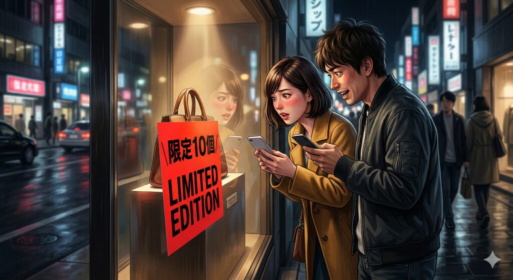 「限定100個」の商品に並ぶ長い行列。これを見た人は、「あんなに並んでいるのだから、絶対に価値があるはずだ」という社会的証明(Social Proof)の罠にハマります。他者の欲望が自分の欲望をコピーする。希少性は集団心理によって二次関数的に増幅されるのです。