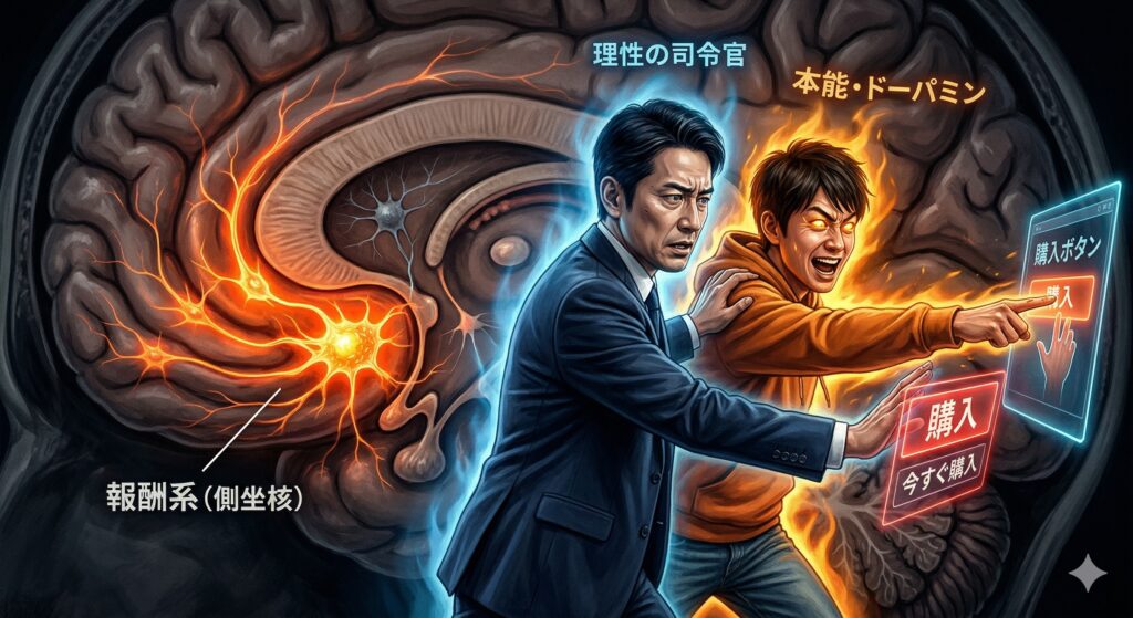 「限定」という条件が加わることで、脳は「競争に勝って報酬を得る」というゲームモードに突入します。このとき放出されるドーパミンは、理性を司る前頭前野の機能を一時的に低下させ、衝動的な行動へと駆り立てるのです。