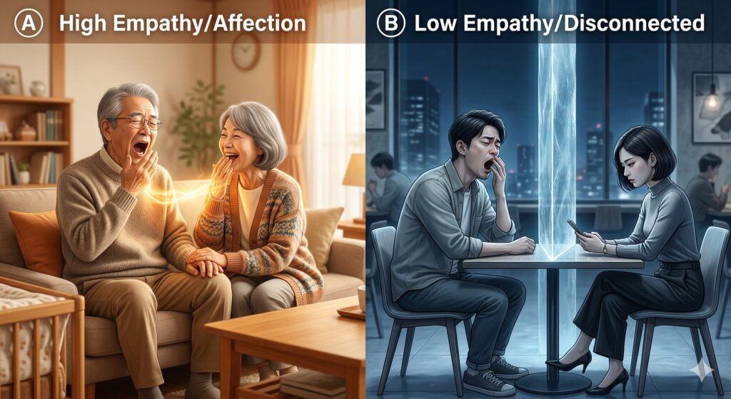最新の心理学的実験によれば、共感性が高いと診断される人ほど、あくびのビデオを見た際の伝染率が有意に高いことが示されています。脳の「共感」を司る部位(下前頭回など)の活動が活発な人ほど、ミラーニューロンの反応も鋭いのです。
