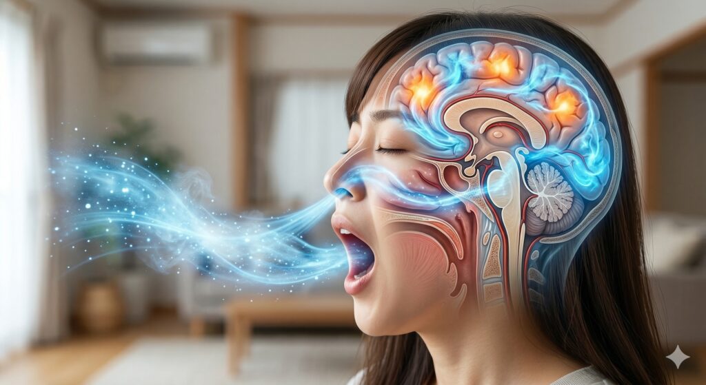 大きく口を開けて空気を吸い込み、顎の筋肉を動かすことで、顔の血管が冷やされます。その冷えた血液が脳に送られることで、オーバーヒート気味の脳をリフレッシュし、覚醒レベルを引き上げるのです。