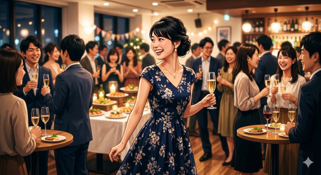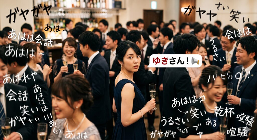 立食パーティーの会場。あちこちでグラスが触れ合う音がし、数十人の話し声が重なり合って、もはや「意味のある言葉」としては判別不能な騒音の海になっています。