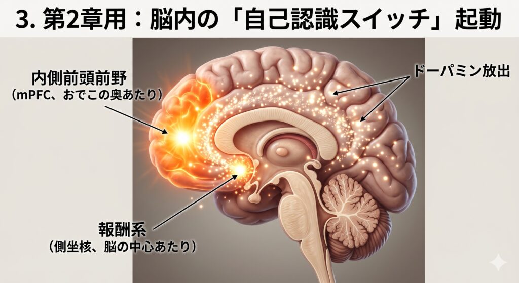 さて、いよいよ本件の核心、なぜ名前を呼ばれると「親近感」という感情が湧くのかを捜査します。そこには、脳の報酬系と自己認識のシステムが深く関わっています。