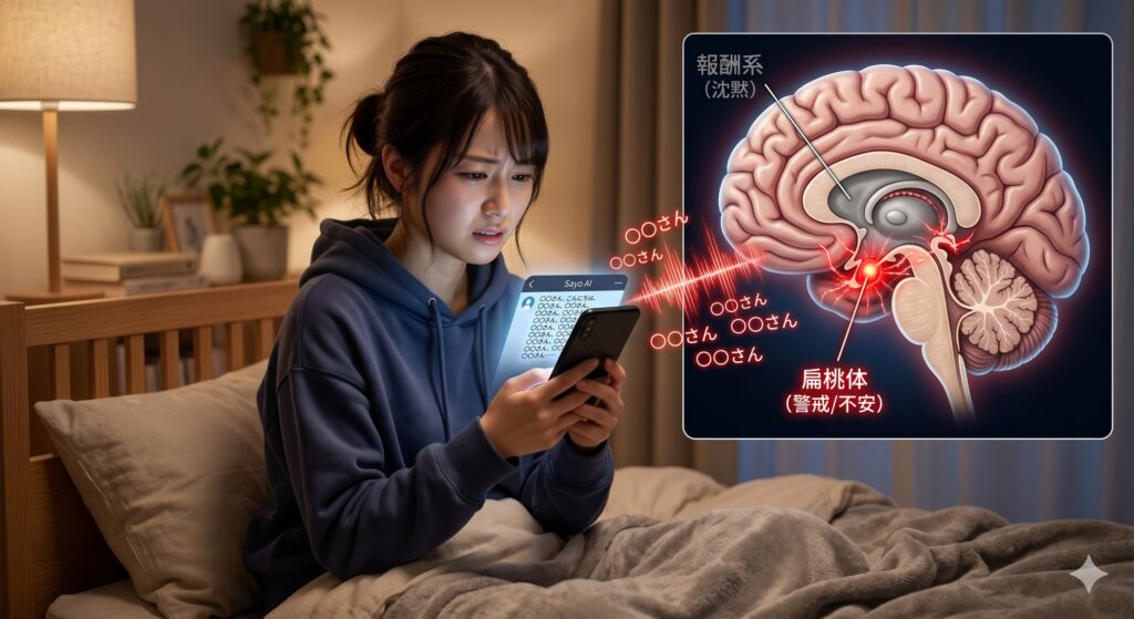 AIが機械的に何度も名前を呼んでくる場合、脳は最初こそ反応しますが、すぐに「これは承認を装った操作だ」と察知します。あまりにも不自然に名前を連呼されると、報酬系は沈黙し、逆に不快感や警戒心を司る扁桃体が刺激されます。これを「パーソナライズの不気味の谷」と呼びます。