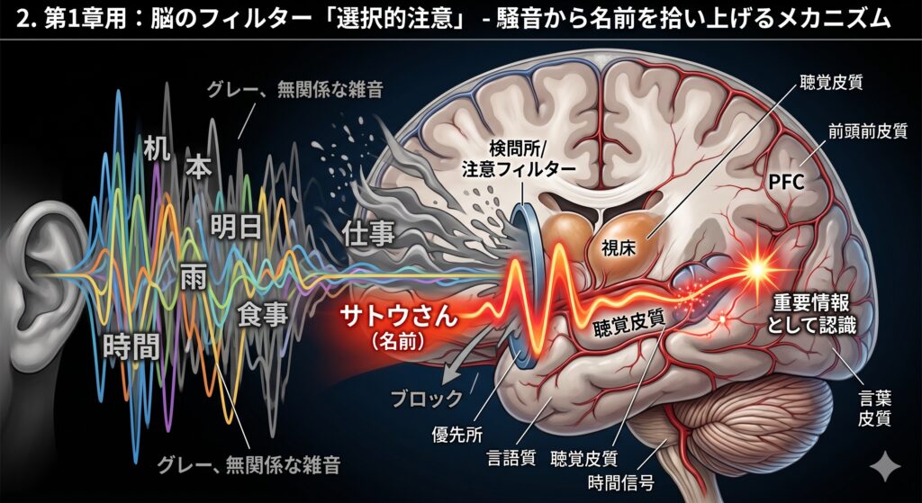 - カクテルパーティー効果の正体: 脳が「自分の名前」を生存に不可欠な最優先情報としてフィルタリングしていること。