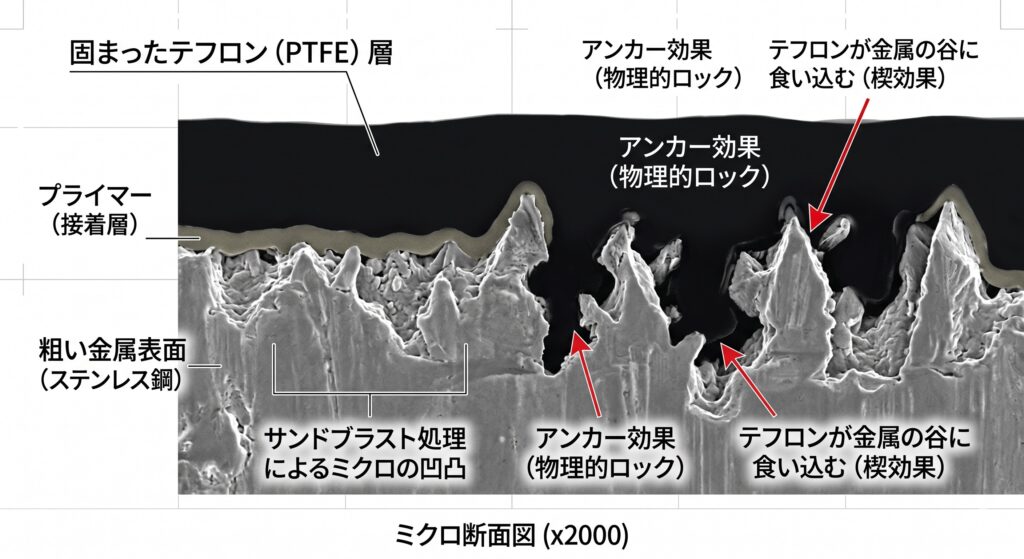 | アンカー効果 | 液体状の樹脂を流し込み、固める | 固まったテフロンが金属の凹凸に食い込み、物理的に抜けなくする |