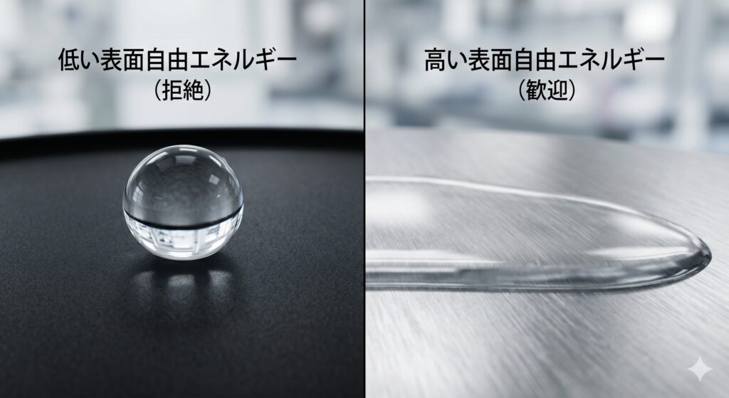 さて、いよいよ本件の核心、今回の重要キーワードである「表面自由エネルギー」について捜査しましょう。これが「くっつかない」現象の物理的な正体です。