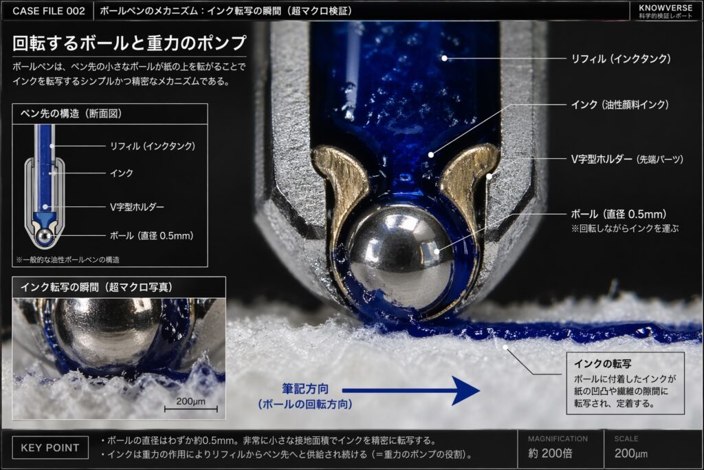 現場検証:ペン先は「回転するボール」と「重力のポンプ」