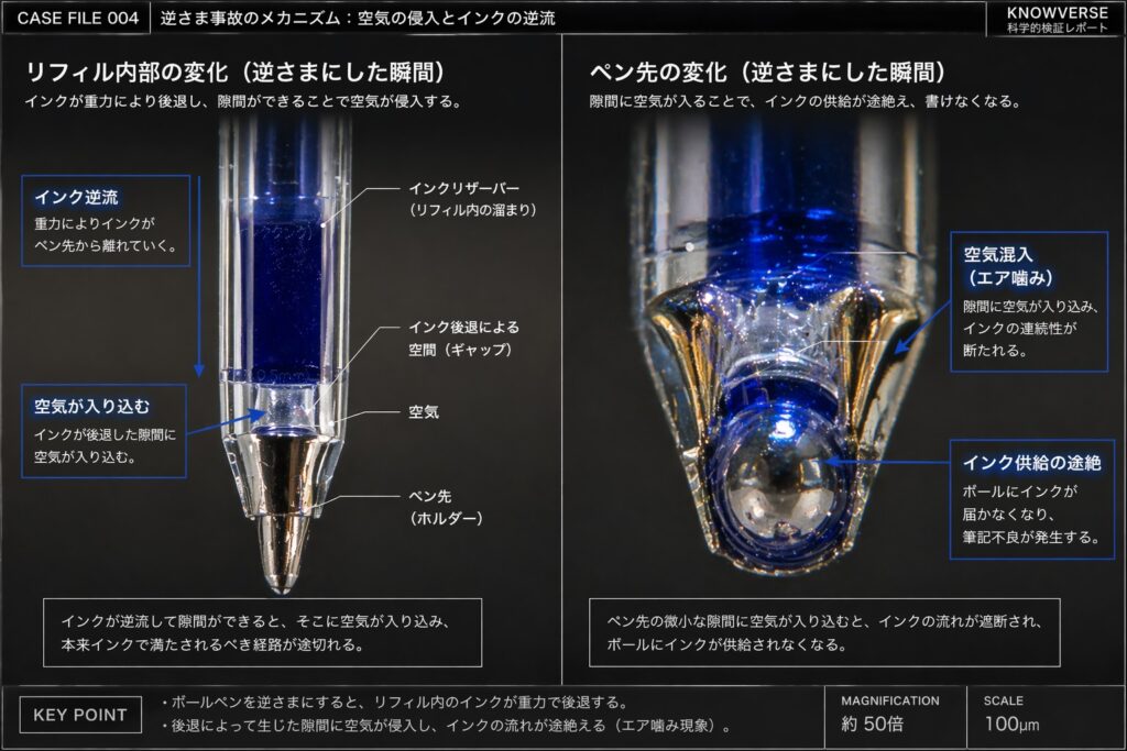 さて、本件の核心、なぜ「逆さま」にすると書けなくなるのか。そこには単に「インクが落ちてこない」以上の、恐ろしいリスクが隠されています。