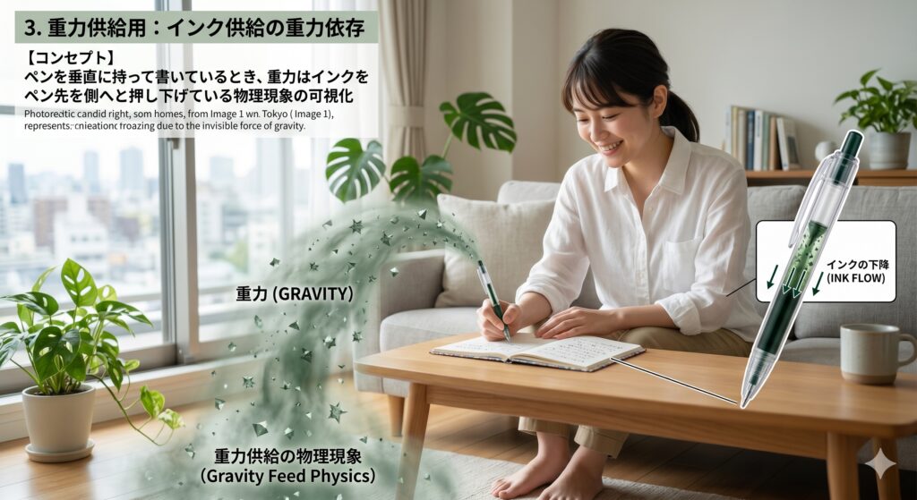 次にあなたがボールペンを手に取るとき。その細い軸の中で、重力がインクをそっとペン先へと押し続け、私たちの文字を支えている……そんな「沈黙の協力者」の存在を感じてみてください。