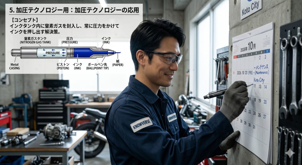 例えば、三菱鉛筆の「パワータンク」などは、ノックする力で内部を微加圧し、上向き筆記を可能にしています。