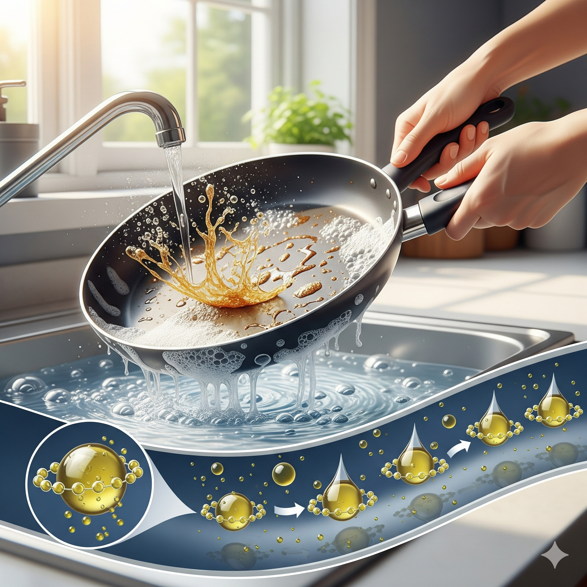 食器を洗っているとき、ベタベタした油汚れがなかなか落ちない経験は誰しもあるでしょう。水で流しても、水玉がコロコロ転がるだけで油は残ります。これは「水」と「油」が性質の違う物質だから。水は極性分子で互いに引き合う性質を持ち、油は非極性で水をはじきます。まるで相性の悪い二人のように、混じり合うことができません。
