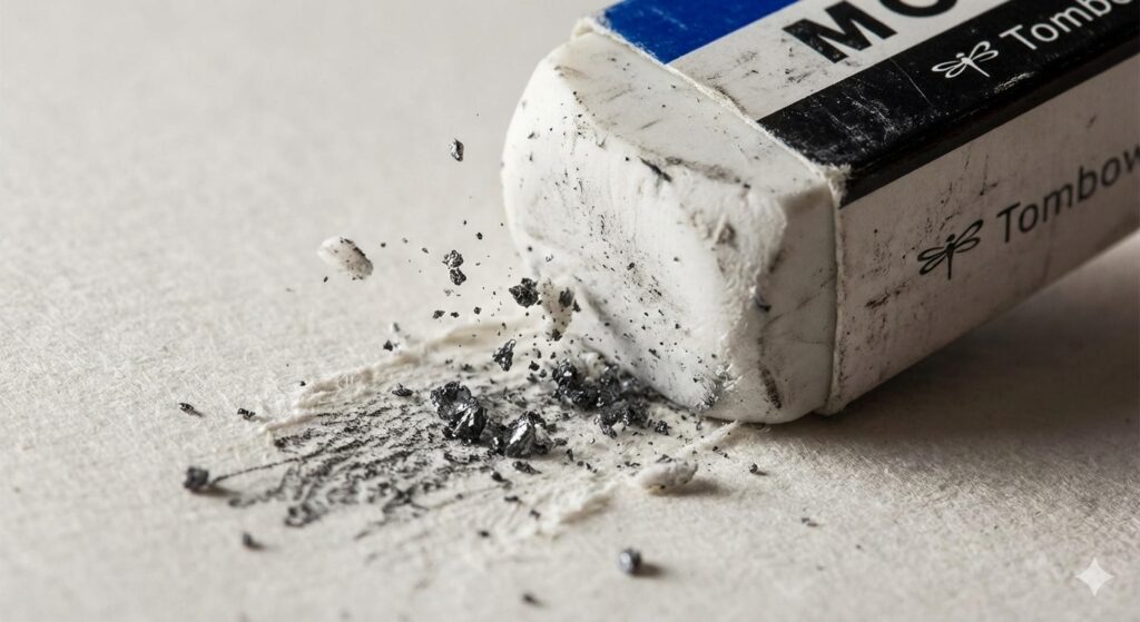 - 常に新品の顔: 表面が削れ続けることで、消しゴムは常に「黒鉛を吸着できる新しい面」を紙に押し当てることができるのです。