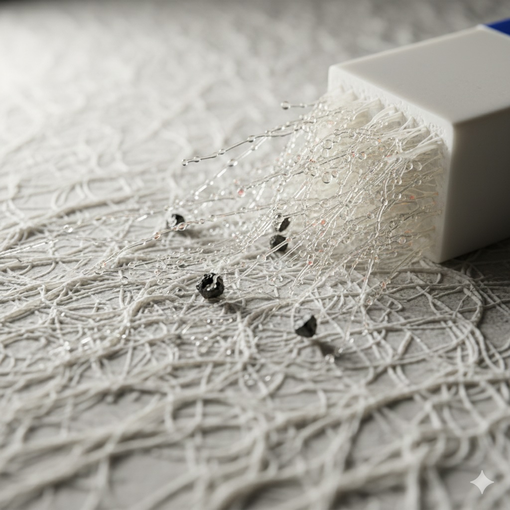 なぜ消しゴムは鉛筆の跡を消せるのか? それは、可塑剤によって粘りを出した「ポリマー」が、紙の上に乗っているだけの「黒鉛粒子」を強力に吸着し、自らを「カス」として犠牲にしながら汚れを包み込んで運び去るからです。