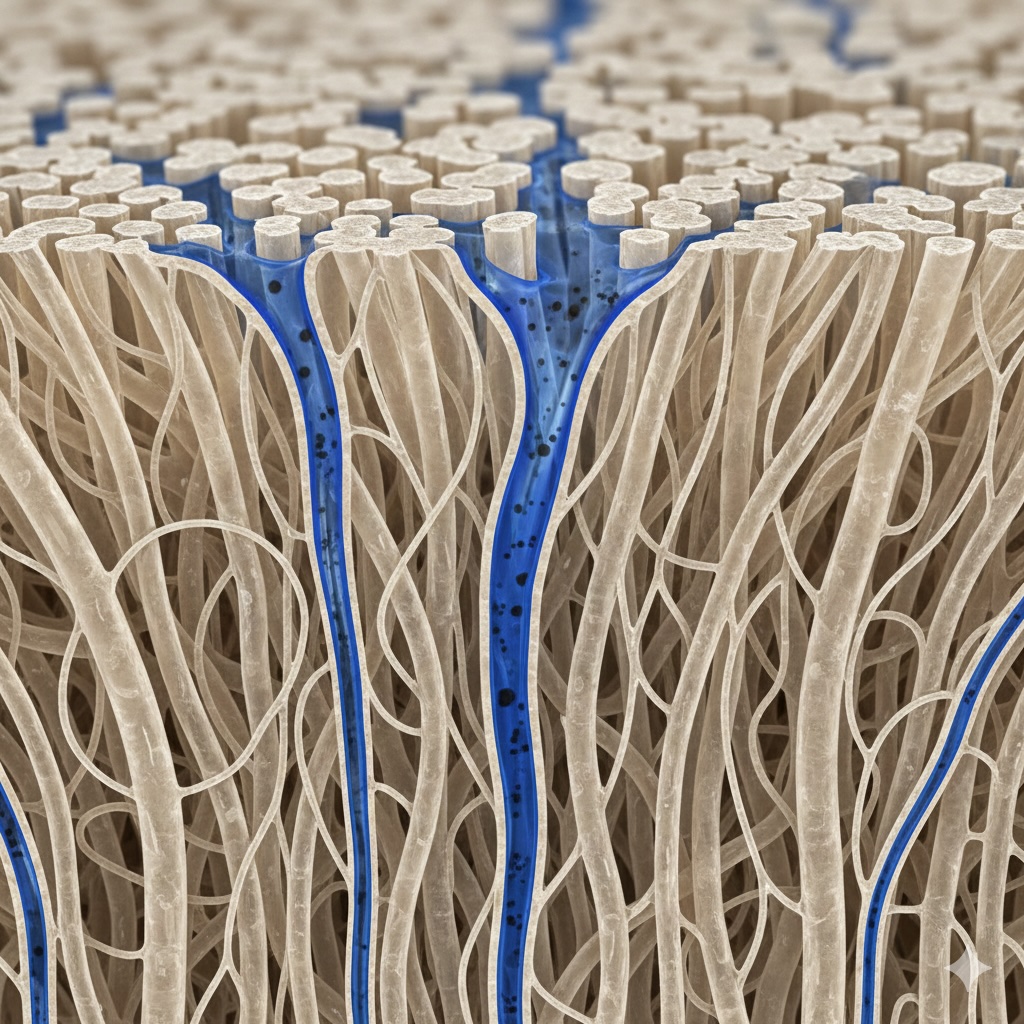 紙を拡大すると、植物の繊維(セルロース)が複雑に重なり合った「ミクロの隙間」だらけの構造をしています。