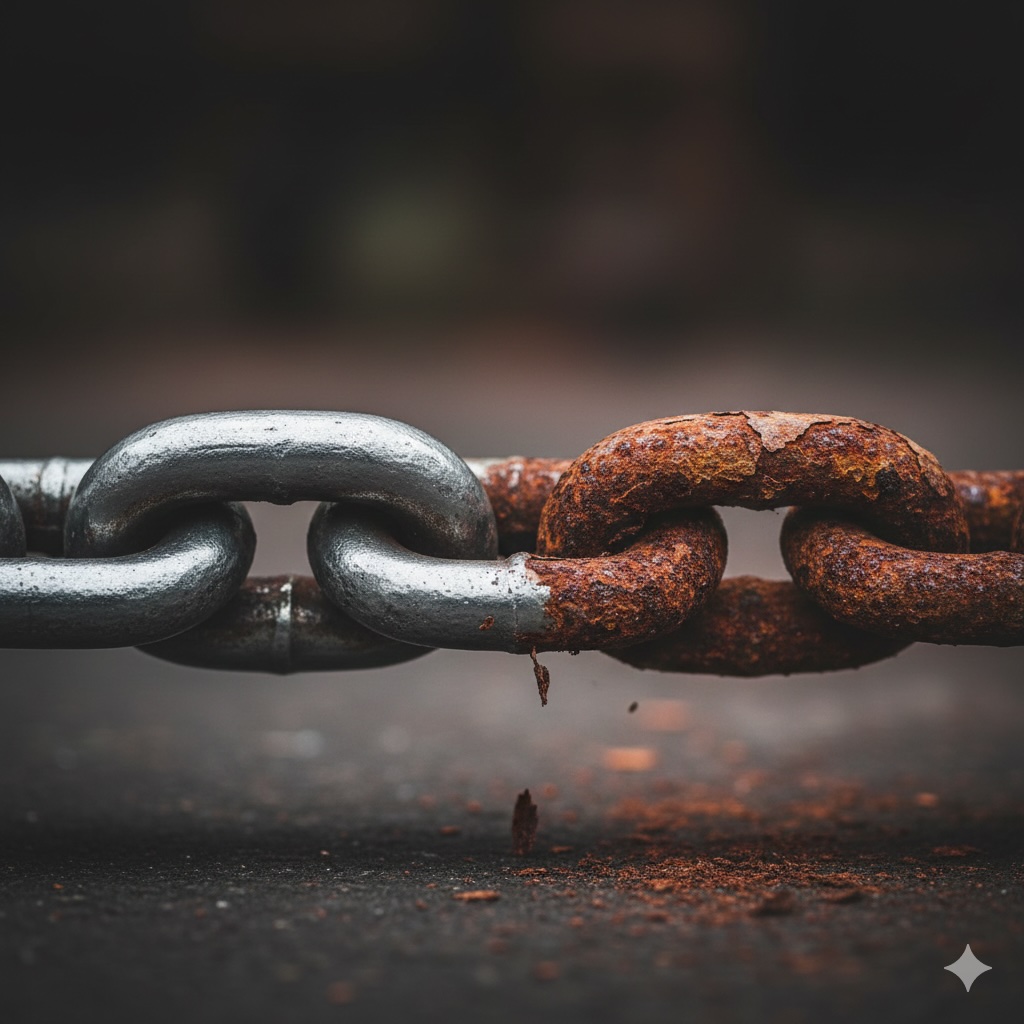 - 鉄の悲劇: 鉄が作るサビは、隙間だらけの「ボロボロのレンガ壁」のようなものです。そこからどんどん水や酸素が奥まで入ってくるため、芯までボロボロになってしまいます。