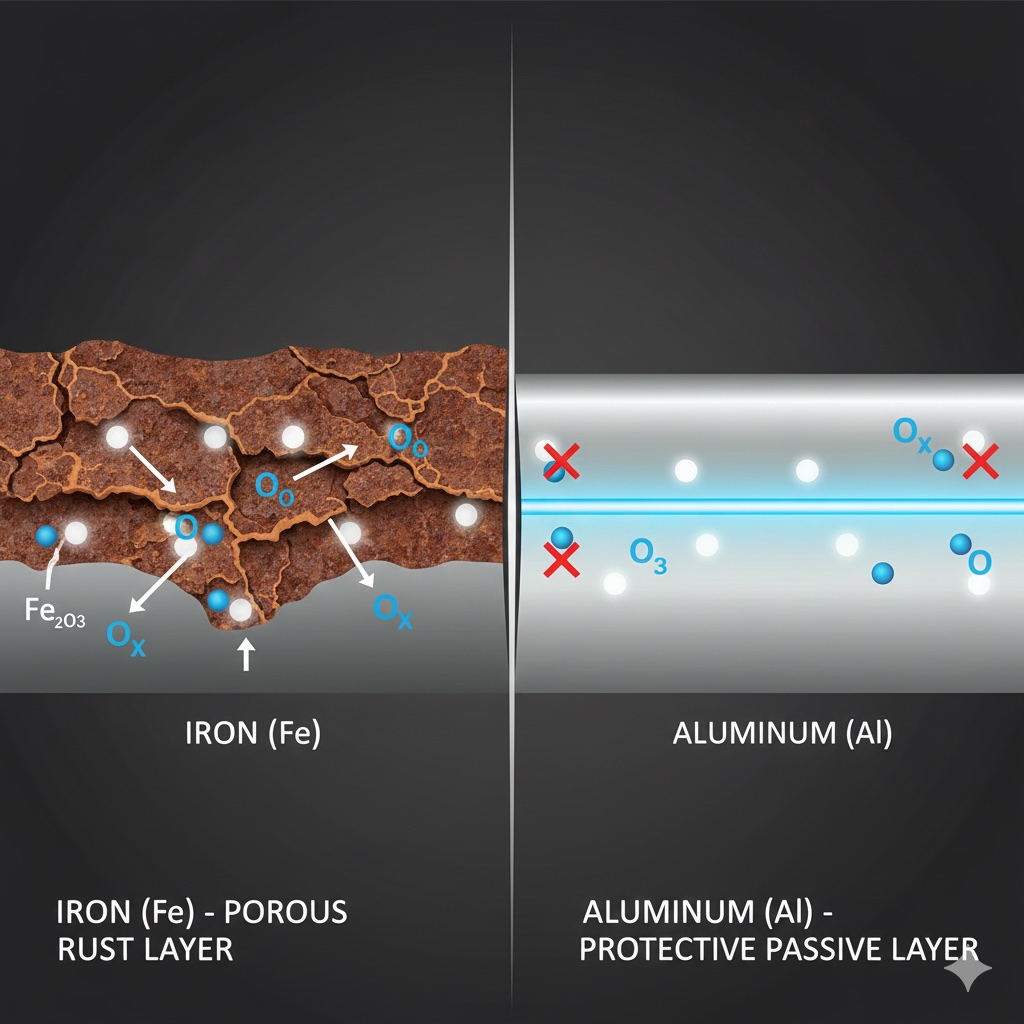 アルミやステンレスも、実は鉄以上に「酸素と手をつなぎたい(サビたい)」性格です。しかし、彼らは鉄よりも要領が良いのです。