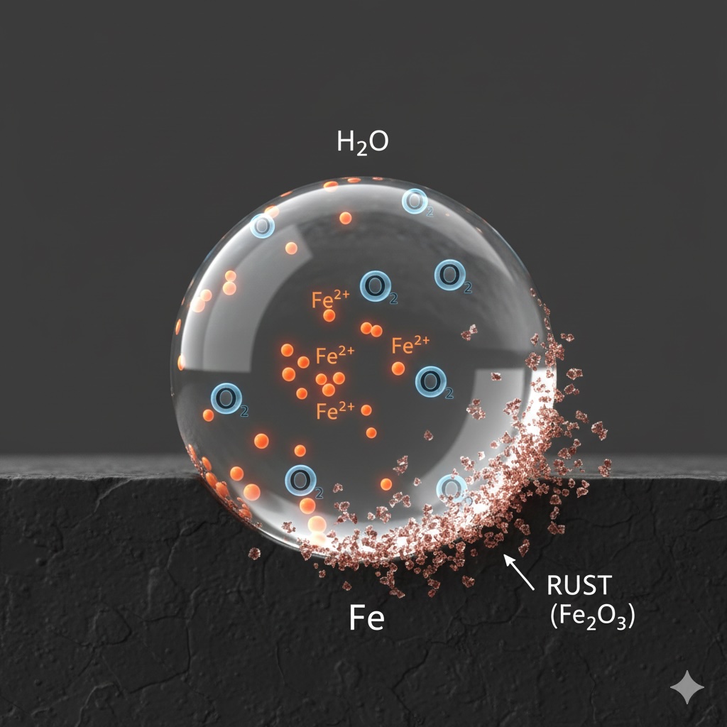 鉄の表面に水滴がつくと、水は鉄の成分が溶け出しやすい環境を作ります。水という「道」ができることで、鉄は自分のエネルギー(電子)を酸素に受け渡し、スムーズに握手ができるようになります。