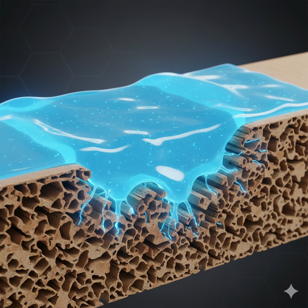 どんなに滑らかに見える段ボールの表面も、ミクロの世界ではエベレストのような凸凹だらけです。ガムテープを貼る時、粘着剤は液体のように「流動」し、この複雑な凸凹の隅々まで入り込んでいきます。これを「濡れ(ぬれ)」と呼びます。