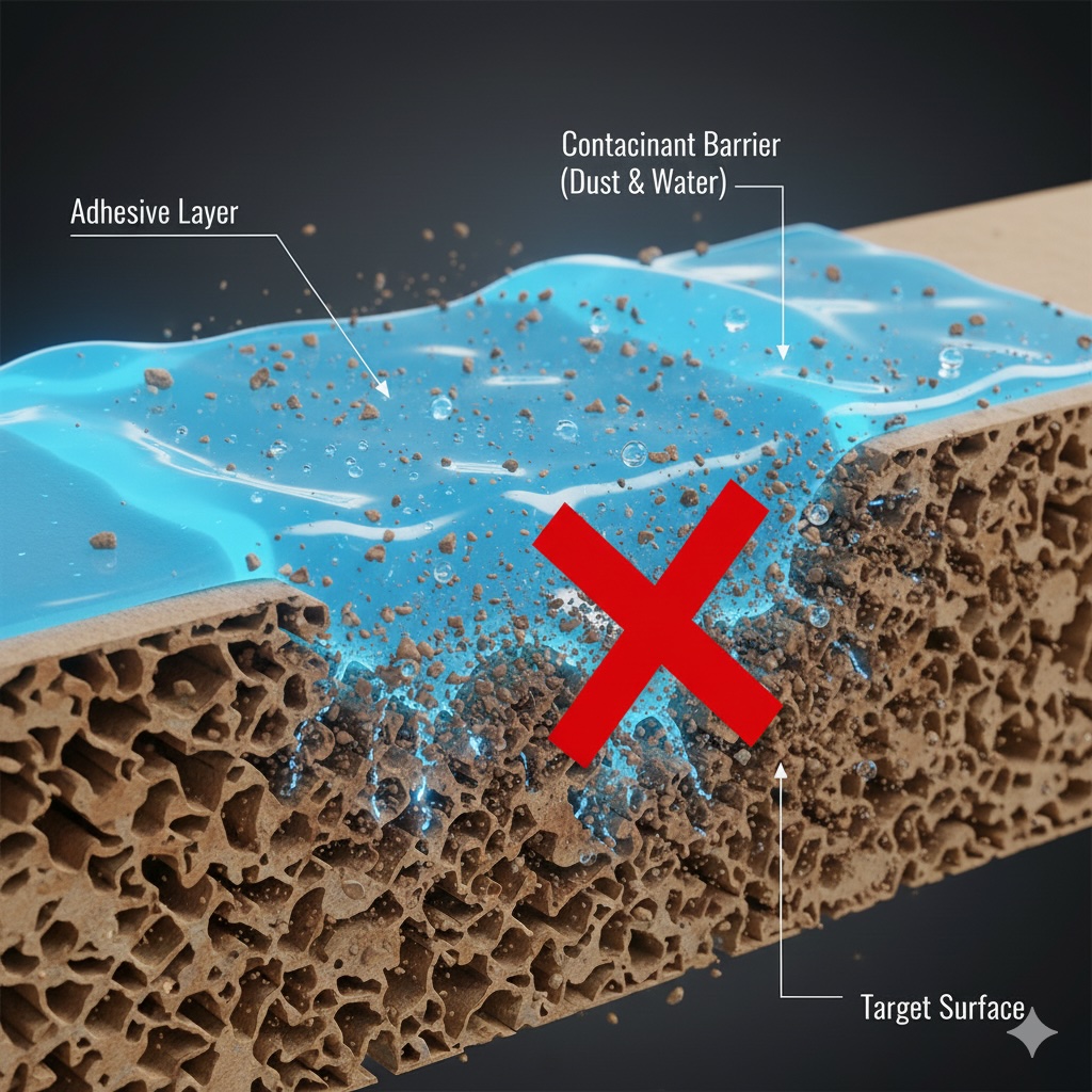 - 水と油(濡れ性の阻害): 水や油がついていると、粘着剤が凸凹へ潜り込むのを邪魔され、分子間力(抱擁)が発生しません。