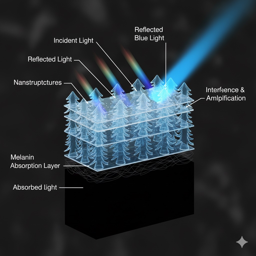- 影の共犯者: 構造色の下には必ず「黒い色素(メラニン)」が配置されています。これが反射しきれなかった余分な光を吸収する「フィルター」として働くことで、鮮やかな青を劇的に浮かび上がらせているのです。
