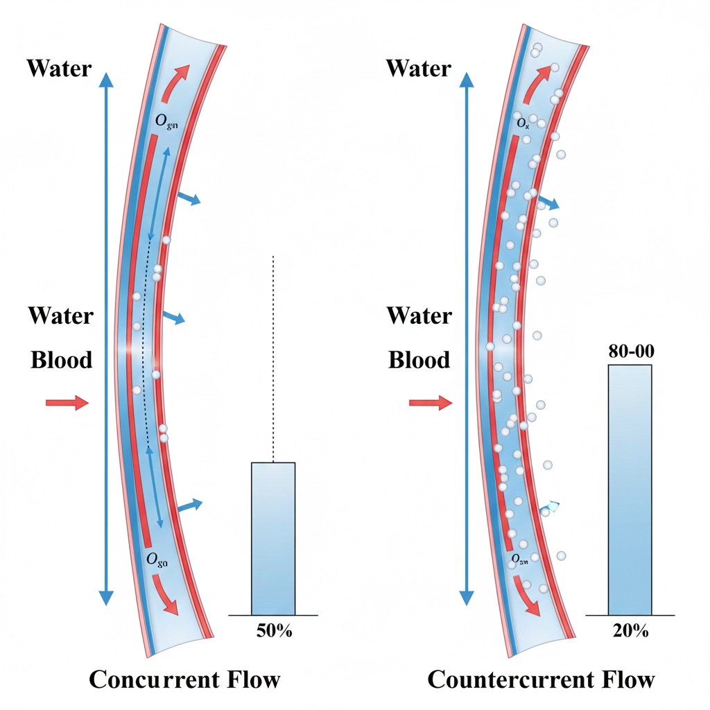 - 向流(逆向きなら): 血液は常に「自分より少しだけ酸素が多い水」と出会い続けることができます。この物理的な工夫により、魚は水中の酸素の80%以上を回収できるのです。
