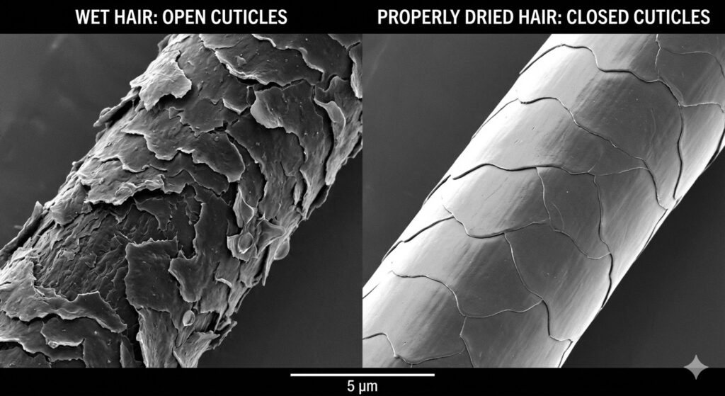 髪を乾かすとき、ただ水分を飛ばせばいいわけではありません。髪の表面には「キューティクル」というウロコ状の組織があります。