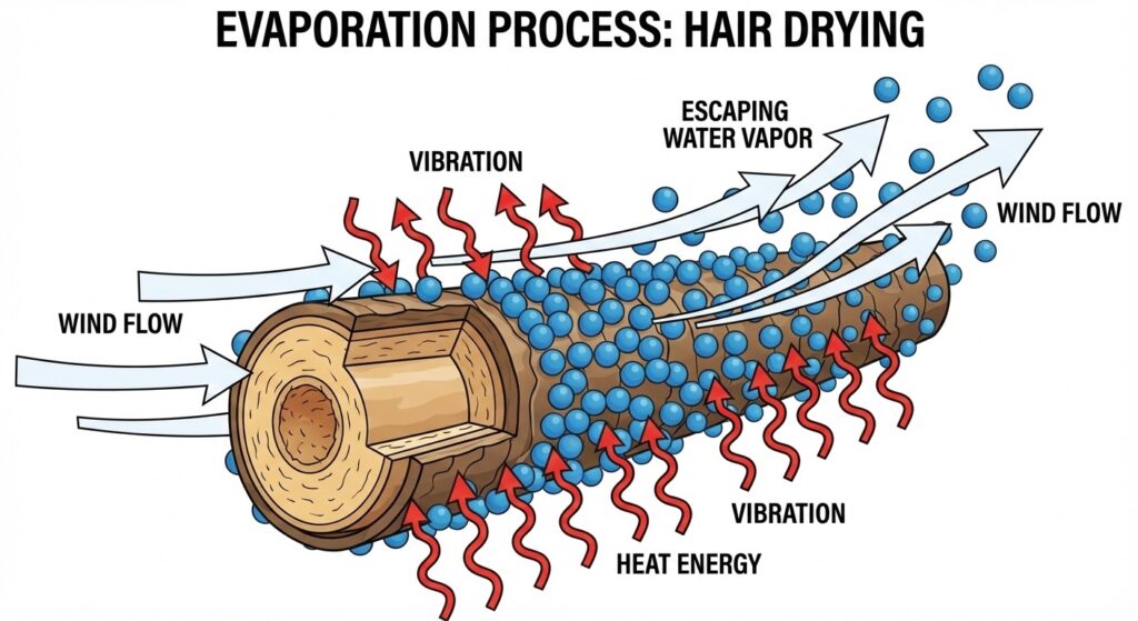 - 「風」で出口を空ける: 髪の周りが湿ったままだと、飛び出そうとした水分子が戻ってきてしまいます。ドライヤーの強い風は、出口付近に溜まった水蒸気を一気に吹き飛ばし、常に「空席(乾いた空気)」を用意します。