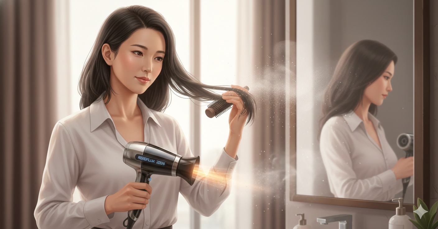 - 水分バランス調整(ナノ技術): 最新のドライヤーは、空気中の水分を微細な粒子に変えて放出します。表面は乾かしつつ、髪の内部に必要な「結合水」は残すことで、パサつきを防ぎます。