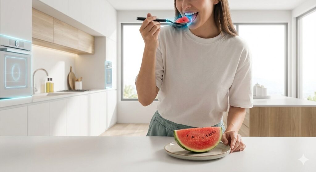 - 電気味覚(デジタル・シーズニング): 2025年に普及した「ソルトチップ搭載スプーン」は、微弱な電気刺激で舌に「偽の塩味」を感じさせます。これにより、実際の塩分を一切摂らずに、スイカやお汁粉の甘味だけをブーストさせることが可能になりました。健康と美味しさを両立させる、究極の「錯覚」活用術です。