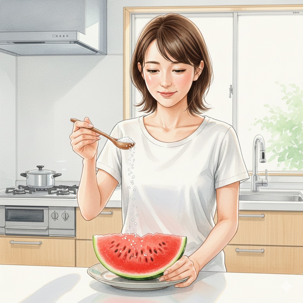 スイカにパラリと一振りの塩。一見すると、塩気は甘さを打ち消してしまいそうですが、実際にはその逆。口の中では「甘味の爆発」が起きています。