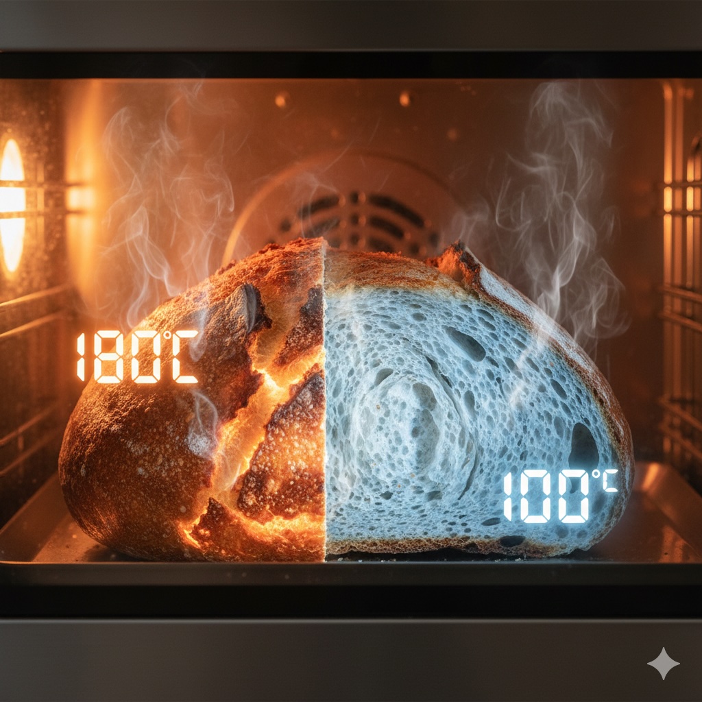 - 表面の乾燥と高温: 一方、オーブンの熱に直接さらされる表面は、水分が急速に蒸発して乾燥します。水分がなくなると温度は一気に 150度 を超え、メイラード反応という名の「芸術」が爆発的に進行するのです。