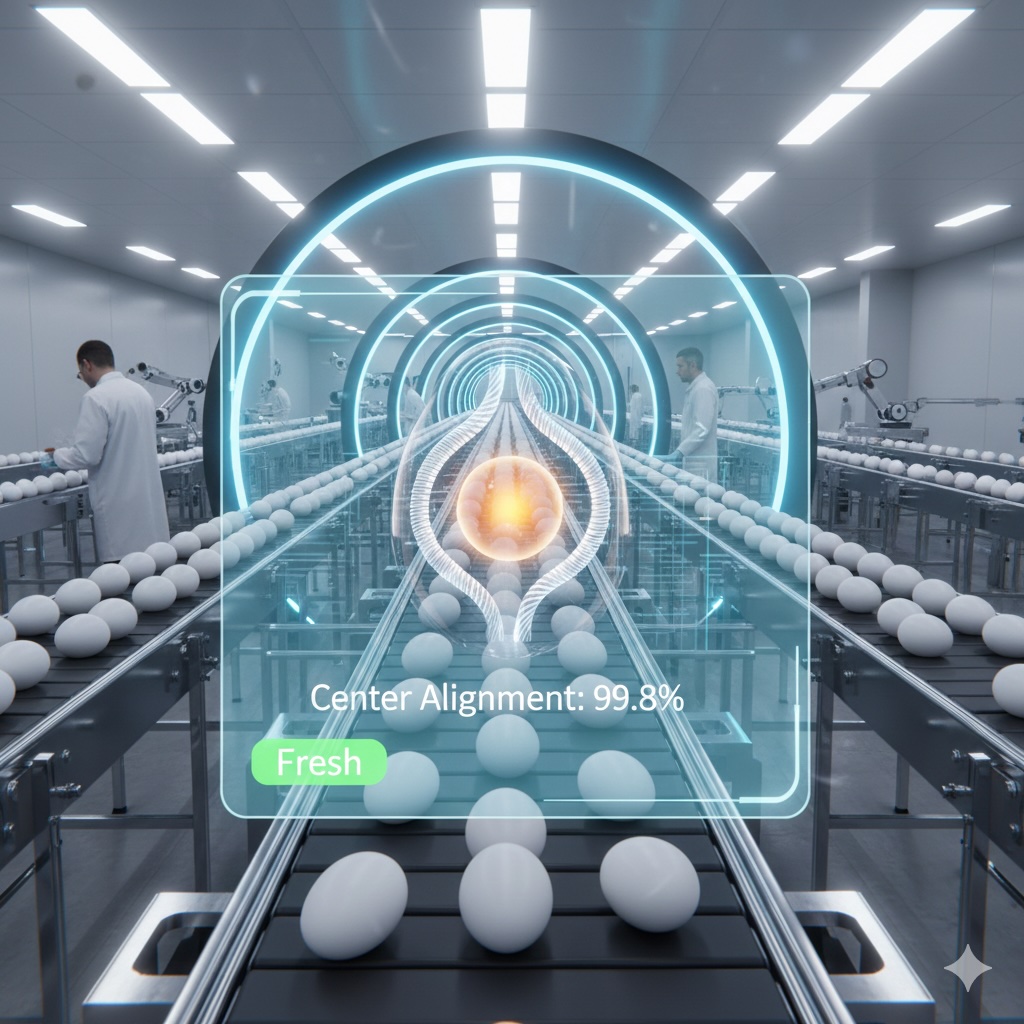 - 非破壊音響スキャン: 2025年に実用化。卵に特定の周波数の微振動を与え、内部の共鳴パターンをAIが解析。カラザの張力が基準以下(=鮮度が低い、または位置がズレている)の卵を、1秒間に数十個のスピードで非接触選別しています。