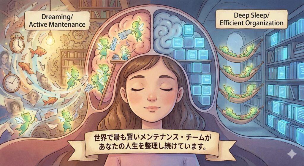 人が夢を見るのは、ただの偶然でも無意味なバグでもありません。それは、私たちが経験したカオスな一日を、整然とした知識へと変え、傷ついた心を癒やし、未知の危機に備えるための「生命維持活動」そのものです。