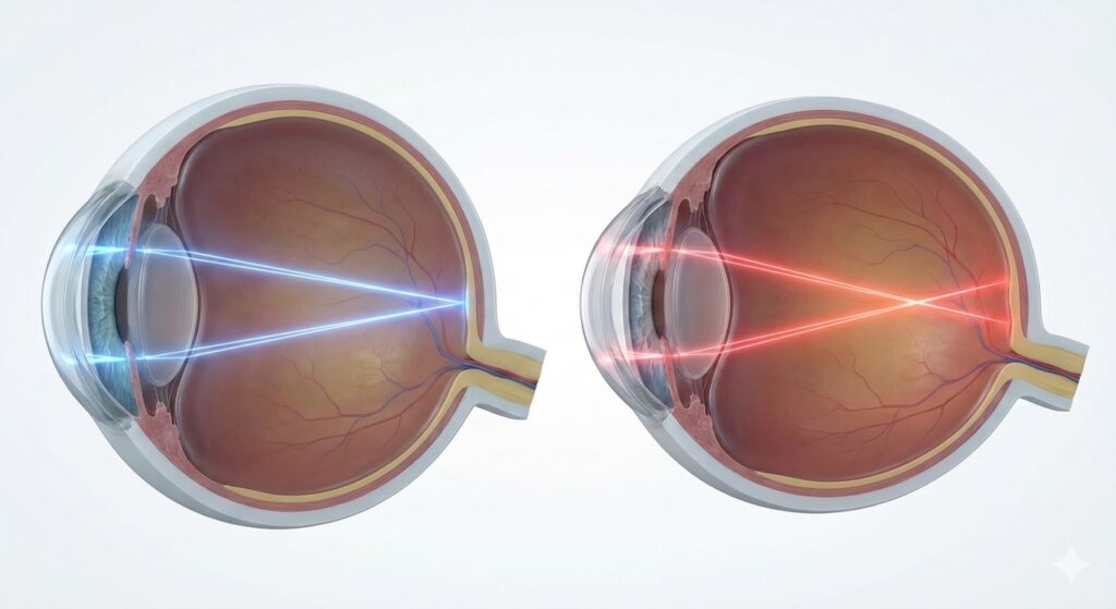 - ピントが届かない: 網膜(スクリーン)が後ろに下がってしまうため、レンズで屈折した光が網膜の手前で像を結んでしまいます。