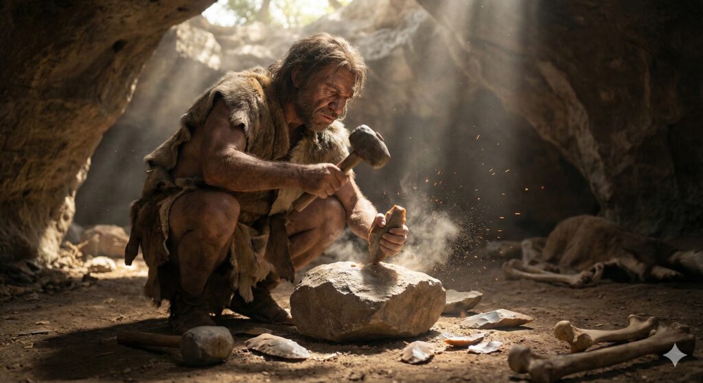 石器を作る際、片手で石を固定し、もう一方の手で鋭い打撃を与えます。この「役割の固定」が、脳の役割分担をさらに加速させました。