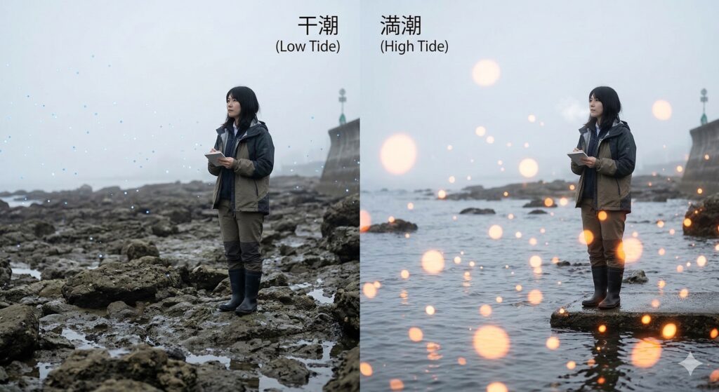 - 小潮(こしお): 半月のとき。太陽と月が直角方向に分かれ、互いの力を打ち消し合うため、潮の動きが小さくなります。