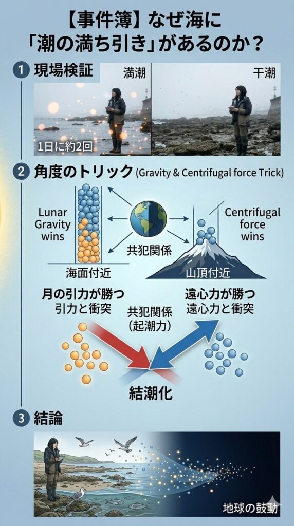 今回の捜査を通じて明らかになったのは、潮の満ち引きが単なる自然の気まぐれではなく、「地球・月・太陽の壮大な力学ドラマ」であるということです。