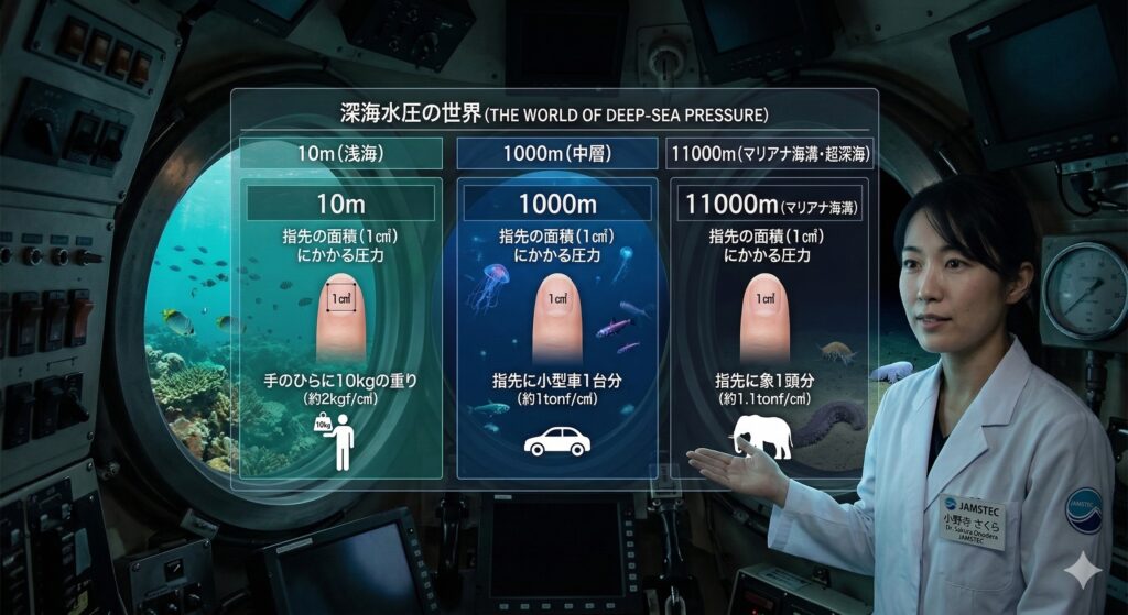 これは、指先の面積(約1平方センチメートル)に1トン以上の重さ(小型車や象1頭分)がかかるという、凄まじい物理的環境です。地上で暮らす私たちが生身で放り込まれれば、一瞬で組織が破壊されてしまうでしょう。