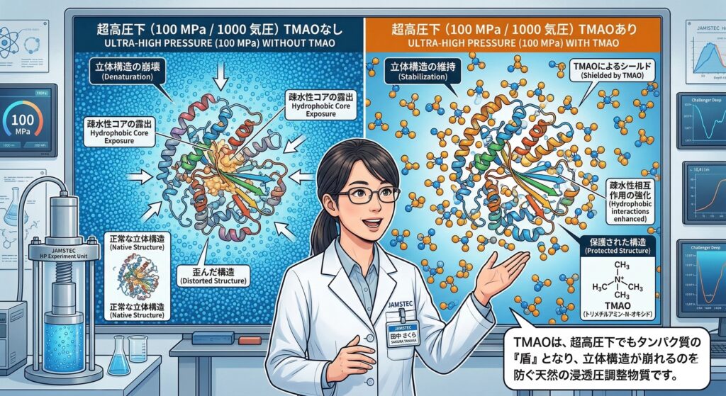 TMAOは、タンパク質分子の周囲で水を組織化し、水圧によってタンパク質の立体構造が崩れるのを防ぐ「添え木」のような役割を果たします。