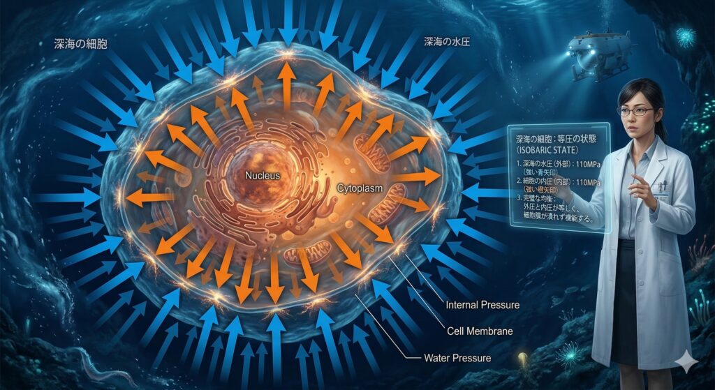 「水は圧縮されないから大丈夫」というのは、半分正解ですが、全てではありません。実は、高圧下では水そのものの物理的性質も変化し、細胞の働きに悪影響を及ぼします。ここで登場するのが、第2の犯人(協力者)である「等圧(とうあつ)の状態」です。