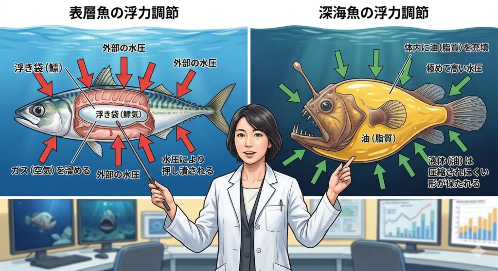 しかし、そんな極限環境でも、深海魚たちは優雅に泳いでいます。なぜ彼らは潰れないのか?その犯人を、私たちは「空気の有無」と「細胞レベルの化学物質」という観点からプロファイリングします。