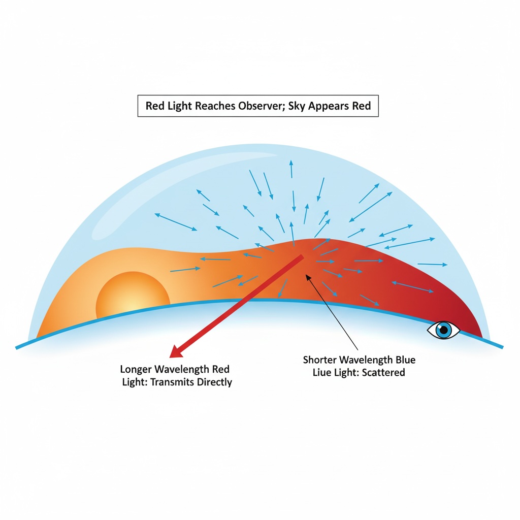- 青や紫など短波長の光は途中でほとんど散乱され、観察者には届かない。