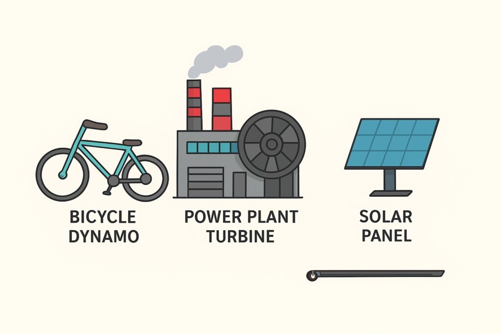 巨大な磁石とコイルを使って「電磁誘導」で電子を押し出します。これは自転車のライトを漕いで光らせるのと同じ仕組みです。